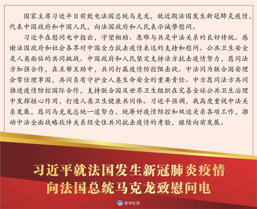 新华社北京3月21日电 国家主席习近平日前致电法国总统马克龙,就近期法国发生新冠肺炎疫情,代表中国政府和中国人民,向法国政府和人民表示诚挚慰问。