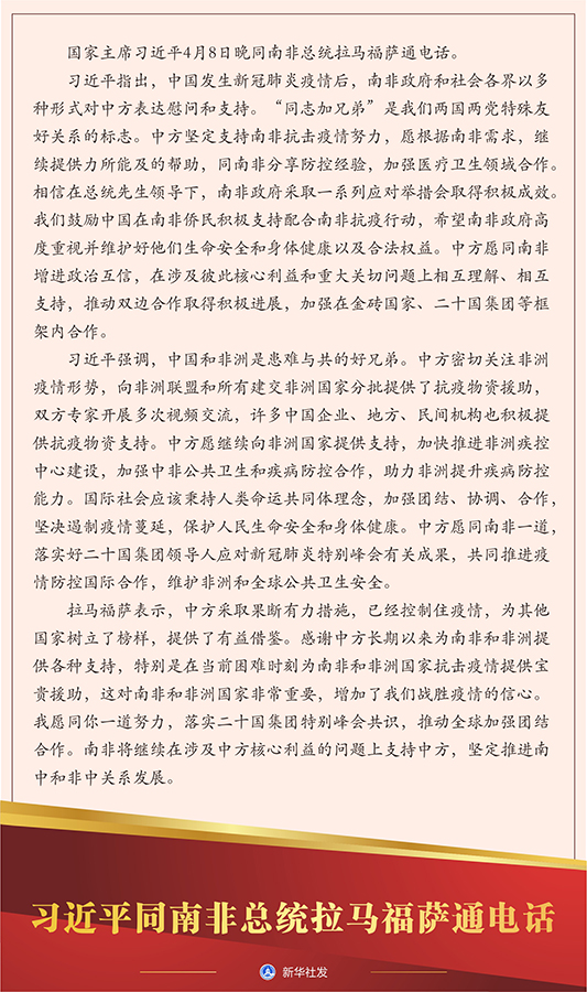 拉马福萨表示,中方采取果断有力措施,已经控制住疫情,为其他国家树立了榜样,提供了有益借鉴。感谢中方长期以来为南非和非洲提供各种支持,特别是在当前困难时刻为南非和非洲国家抗击疫情提供宝贵援助,这对南非和非洲国家非常重要,增加了我们战胜疫情的信心。我愿同你一道努力,落实二十国集团特别峰会共识,推动全球加强团结合作。南非将继续在涉及中方核心利益的问题上支持中方,坚定推进南中和非中关系发展。