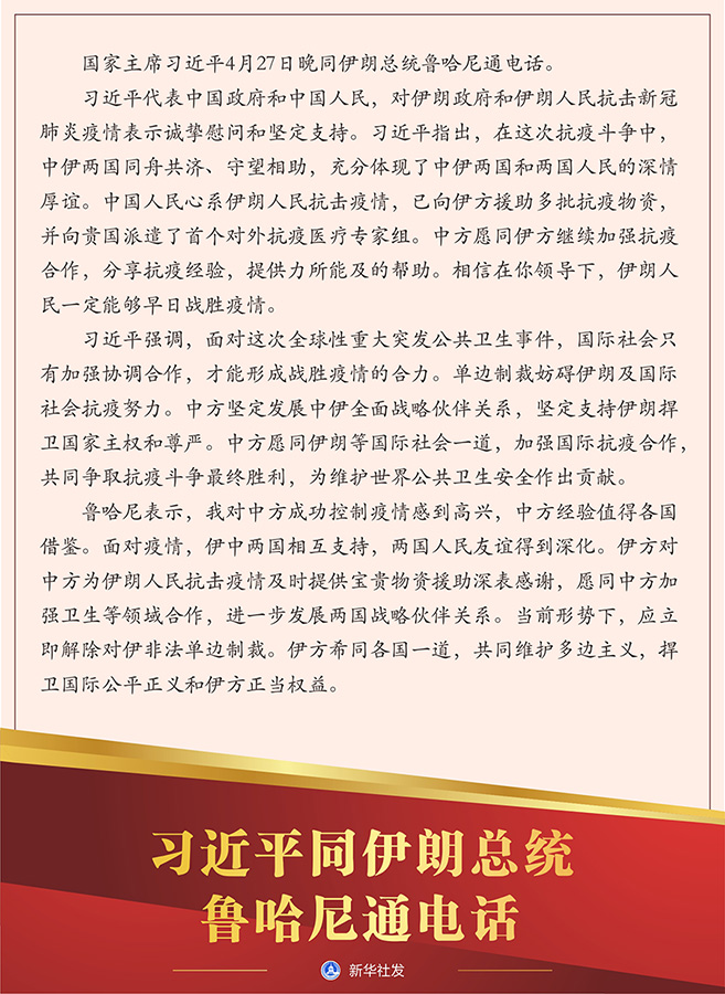 新华社北京4月27日电 国家主席习近平27日晚同伊朗总统鲁哈尼通电话。