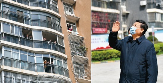 3月10日,习近平在湖北省武汉市东湖新城社区考察时,向在家隔离居住的居民挥手致意、表示慰问(拼版照片)。