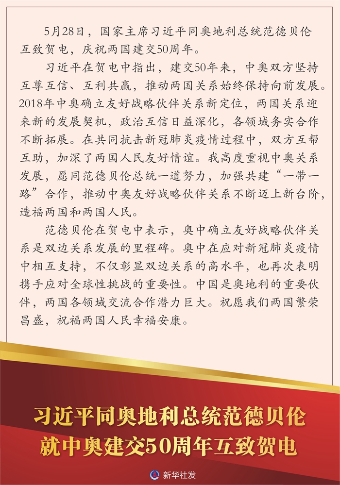 新华社北京5月28日电 5月28日,国家主席习近平同奥地利总统范德贝伦互致贺电,庆祝两国建交50周年。