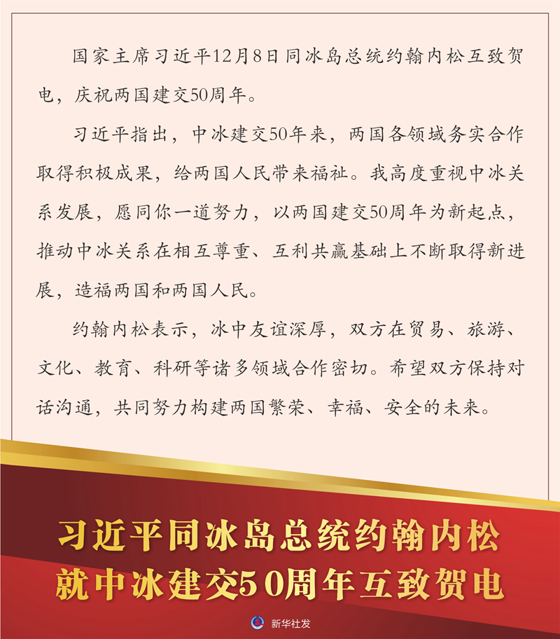 新华社北京12月8日电 国家主席习近平12月8日同冰岛总统约翰内松互致贺电,庆祝两国建交50周年。