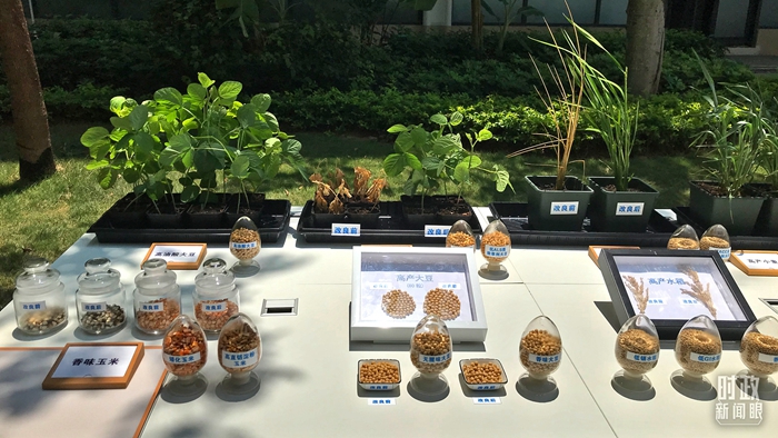 △崖州湾种子实验室,玉米、大豆和水稻改良前后的对比样品。(总台央视记者石伟明拍摄)