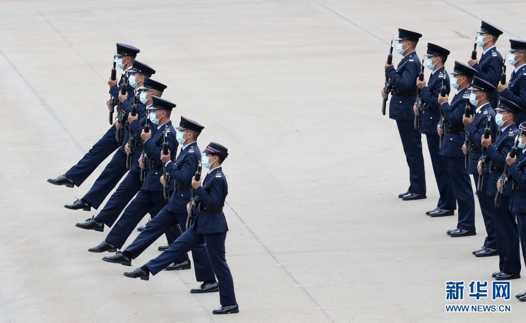 上午10时许,在香港警察学院,随着警察乐队奏响《歌唱祖国》,国旗方队踢正步入场。“向右看齐”“向前看”“向国旗敬礼”,在雄浑有力的口令指挥下,国旗方队迅速完成转体转身、立定靠脚等一系列动作。