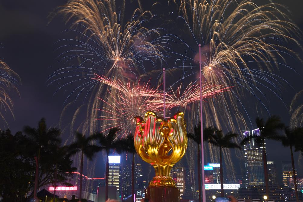最后一幕“大好河山”配以歌曲《大中国》,祝愿祖国繁荣昌盛、国泰民安。绚丽的“中国红”烟花与象征特区区花的紫色烟花左右绽放,不少市民和旅客随着音乐挥动手中的国旗和区旗。