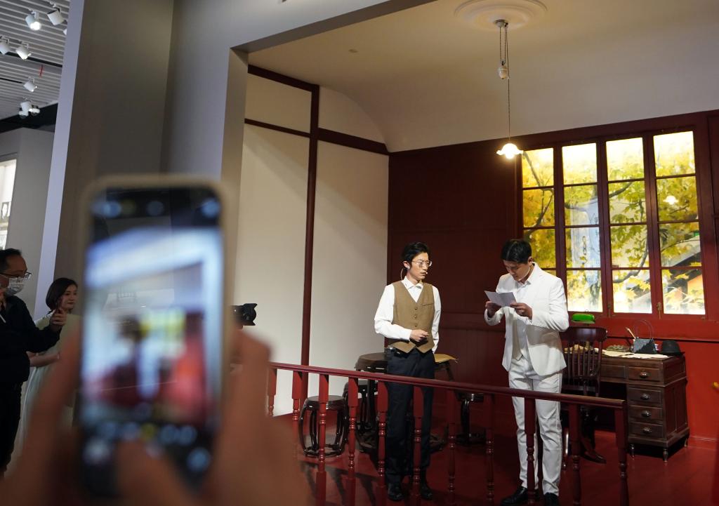 2023年5月18日晚,中共一大纪念馆原创的情景党课《又见新青年》在展厅内实景演出。自2021年中国共产党成立100周年之际全新开放以来,中共一大纪念馆对红色文化的创新传播正不断“圈粉”年轻人。新华社记者 刘颖 摄