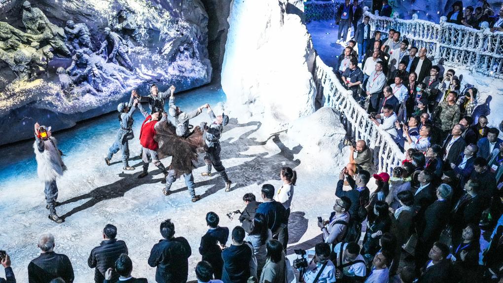 2023年10月22日,观众在位于贵阳市的“红飘带”数字体验馆内观看体验长征故事。以长征为主题的数字体验馆——“红飘带”项目利用全息影像、三维声场等新技术再现伟大长征。新华社记者 陶亮 摄