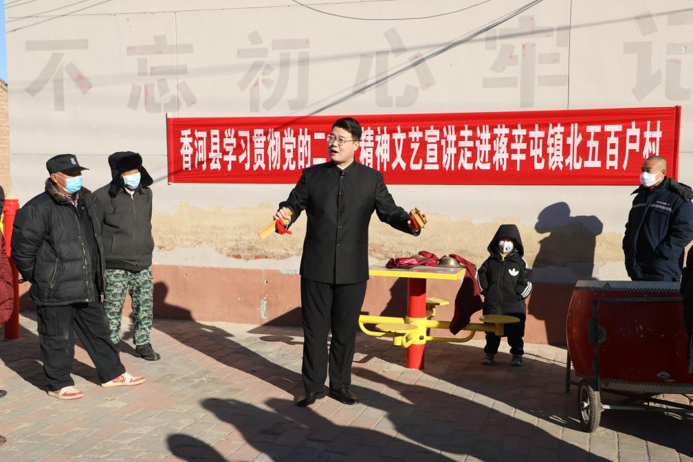 河北省香河县文化馆的文艺工作者张鑫铭在香河县蒋辛屯镇北五百户村进行党的二十大精神“快板宣讲”(2022年12月13日摄)。新华社发