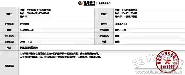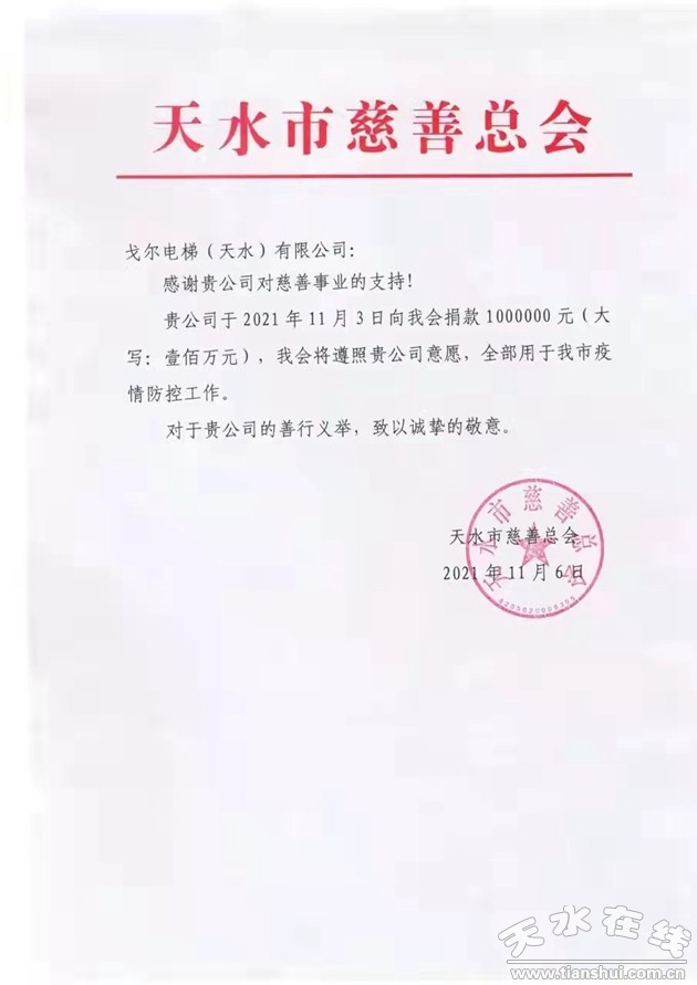 面对疫情,戈尔电梯(天水)有限公司董事长曹杰迅速部署公司防疫工作,并安排公司向天水市捐赠100万元,用于一线抗疫工作,以实际行动为抗击疫情贡献戈尔电梯力量。