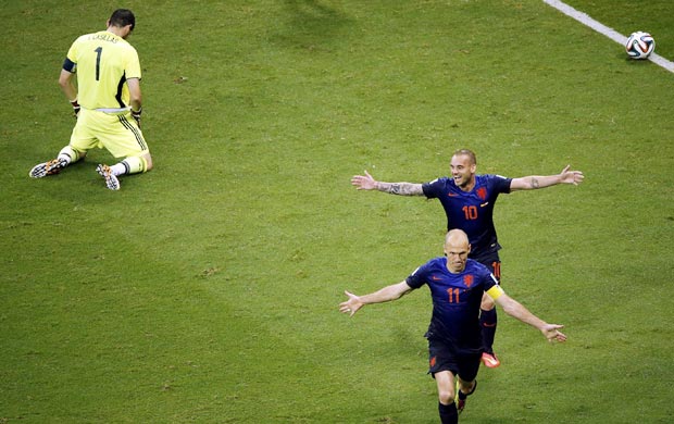 北京时间6月14日凌晨3点,2014年巴西世界杯B组第一轮迎来第一场比赛。在萨尔瓦多的冯特诺瓦球场,上届冠军西班牙1比5不敌上届亚军荷兰,斗牛士军团成为世界杯历史上开局最差的卫冕冠军。这也是西班牙在世界杯史上第二大比分溃败,最惨纪录为1950年时1比6不敌巴西。哈维-阿隆索用一个争议点球打破僵局,荷兰连进五球上演大逆转。范佩西和罗本均梅开二度,中卫德弗里也有一球进账,范佩西还曾射中一次横梁。