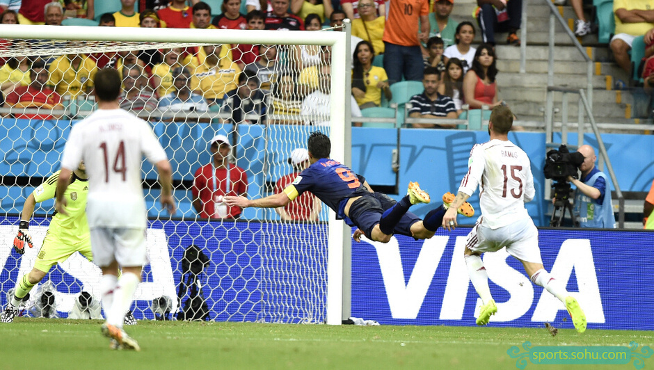 43分钟布林德中场左侧长传,范佩西反越位后点球点附近远距离头球冲顶入网。(进球视频)1比1,荷兰扳平比分,范佩西成为第一位连续三届世界杯破门的荷兰球员!卡西利亚斯世界杯中连续不丢球时间定格在476分钟,西班牙队长无缘超越曾加在1984年世界杯中创下的连续517分钟不丢球历史纪录。
