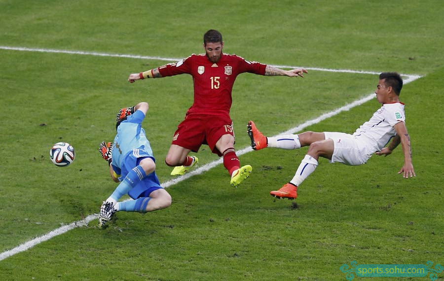 智利用巴尔迪维亚换下巴尔加斯,伊涅斯塔右侧角球传中,拉莫斯禁区中路头球射门弹地后被扑。86分钟弗朗西斯科-席尔瓦背后撞倒托雷斯,智利用卡莫纳换下比达尔,卡索拉禁区弧顶右脚任意球直飞球门右下角,布拉沃判断准确将球飞身扑出底线。科克右侧角球传中,大卫-席尔瓦中路头球回摆,拉莫斯禁区右侧飞身右脚扫射踢飞。91分钟卡索拉右侧横传,拉莫斯中路小禁区外右脚推射被梅德尔挡出。卡索拉右侧角球传中,阿尔巴左侧禁区前左脚抽射踢飞。最终智利2比0战胜西班牙提前出线,西班牙则提前出局。(丁武)