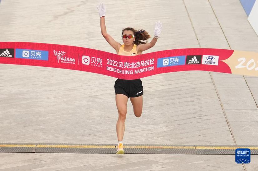 11月6日,夏雨雨在比赛中冲线。她以2小时28分57秒的成绩获得女子组第一名。当日,2022北京马拉松赛在北京举行。新华社记者 鞠焕宗 摄