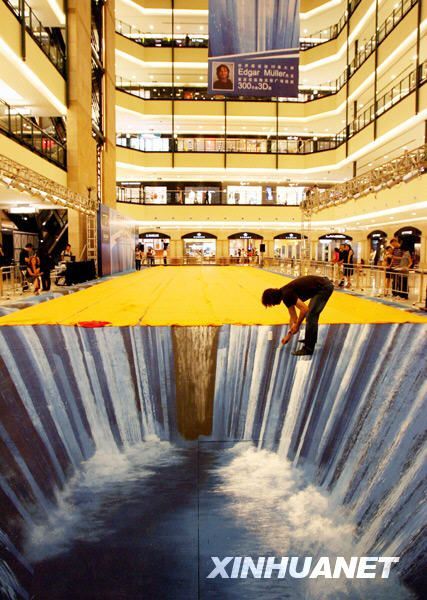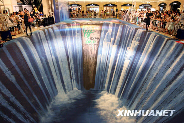 新华网8月6日电 当日,一幅巨型3D立体画在上海静安区梅龙镇广场亮相。这幅以2010年上海世博会为主题的3D立体画由世界3D立体画大师埃德加·米勒精心打造。画面以湍急的瀑布为背景,融入了世博会会徽等元素,效果逼真,极富视觉冲击力,整幅画的面积达300平方米。新华社记者 刘颖 摄 (本文来源:新华网 )