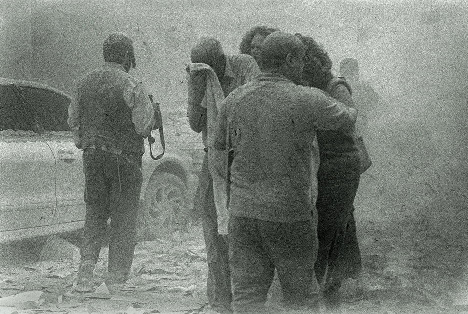 2001年9月11日,大楼倒塌后激起了巨大的烟尘。图为躲过一劫的人们在曼哈顿街头避难。