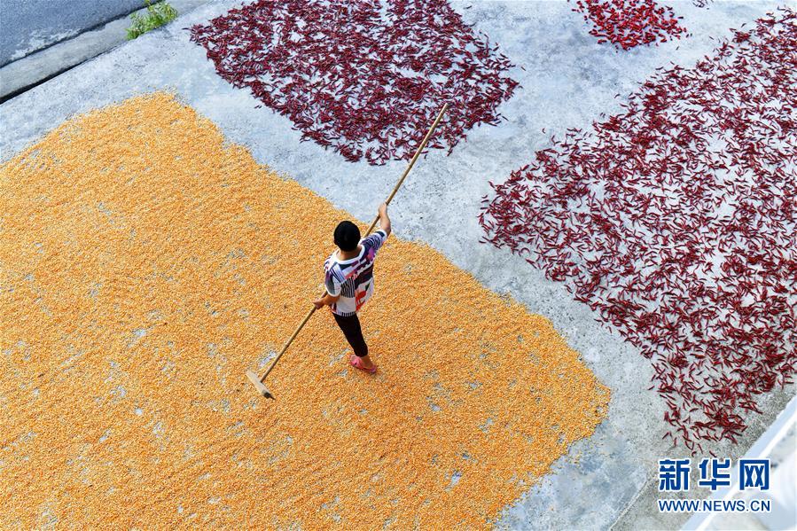 8月26日,贵州省遵义市凤冈县土溪镇石桥村村民在晾晒玉米和红辣椒。眼下,在贵州省遵义市各地农村,村民们把收获的红辣椒、玉米等铺放在房前屋后进行晾晒,构成一幅幅美丽的“晒秋图”。新华社发(罗星汉 摄)