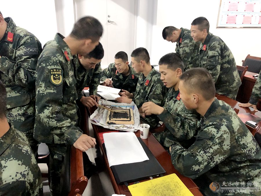 到了天水武警二中队,武警战士参观了展板内容的同时,社教专员还为官兵带去了“活字印刷”体验活动,战士们亲自体验排版、上墨、铺纸印刷、揭纸,活动气氛非常欢快。流动博物馆丰富了部队军营的文化生活,为武警战士送上了精神食粮,让他们不出军营就可以了解天水的民俗文化。通过开展本次活动不仅加强了军民共建和文明城市创建工作,而且增进了军地友谊。