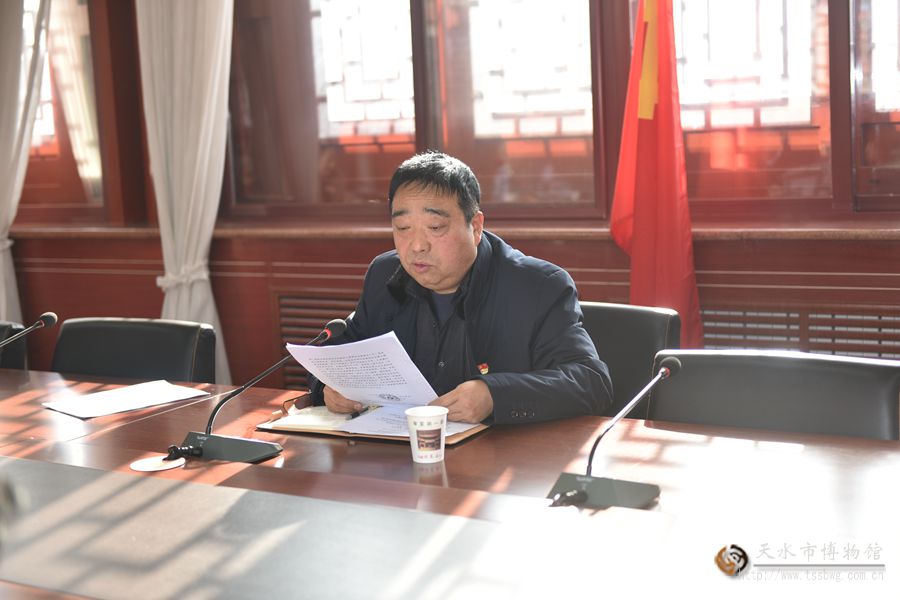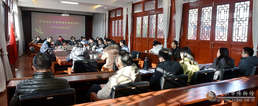 12月27日,中共天水市博物馆支部委员会召开12月份主题党日大会,学习有关通知并观看“不忘初心、牢记使命”主题教育专题片。会议由市博物馆副馆长、党支部委员管玉主持,在家全体党员参加会议。