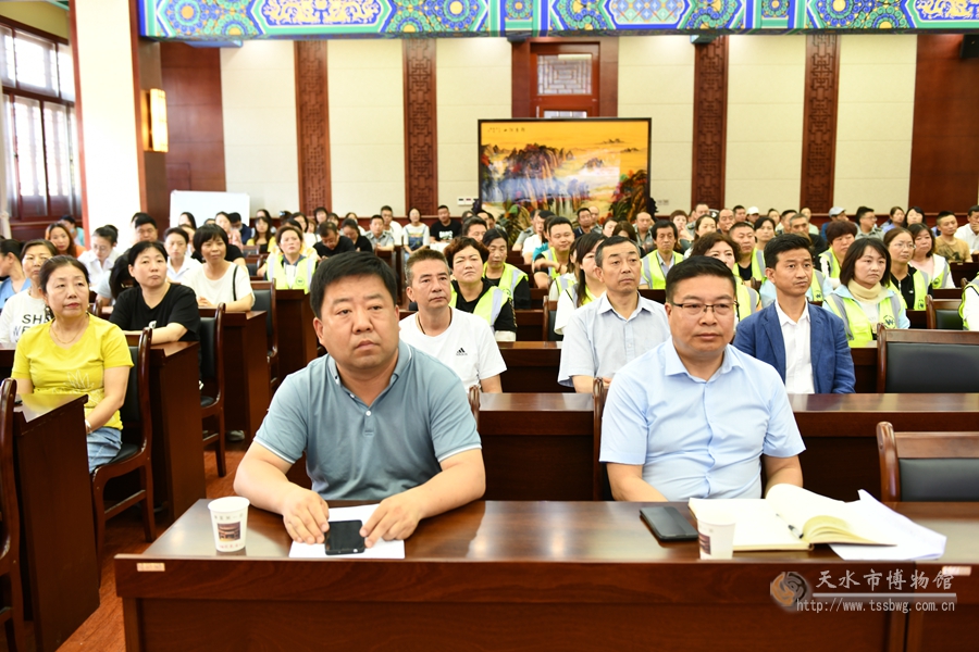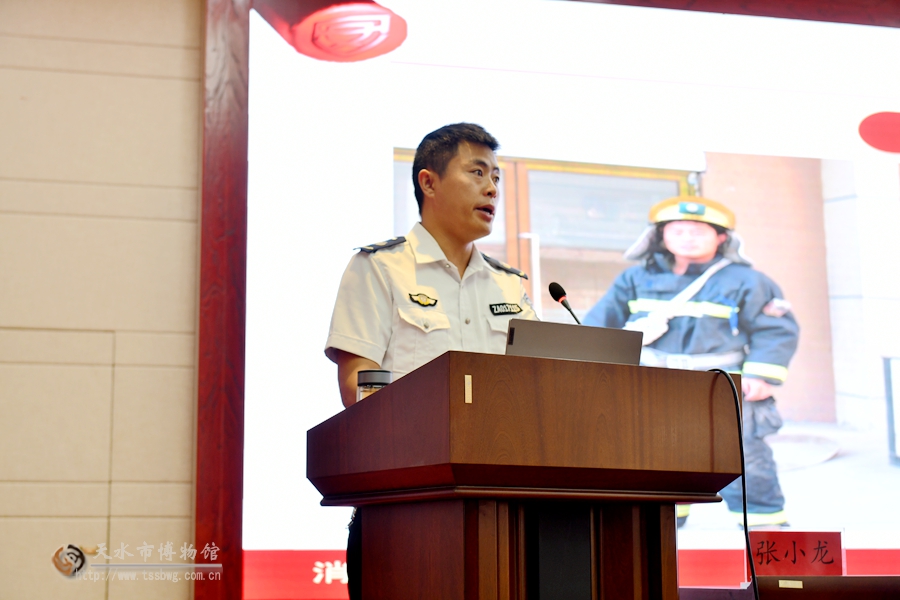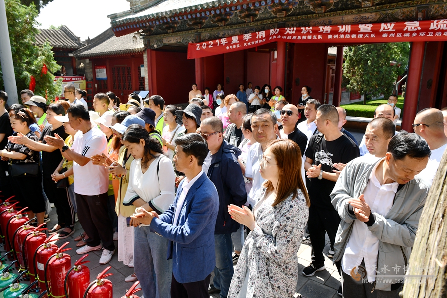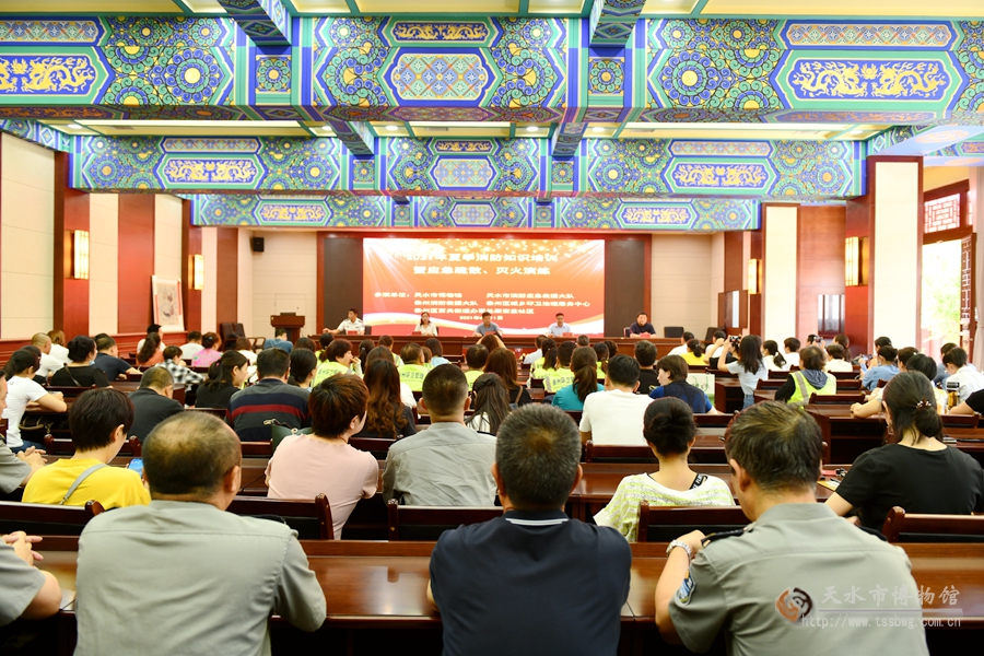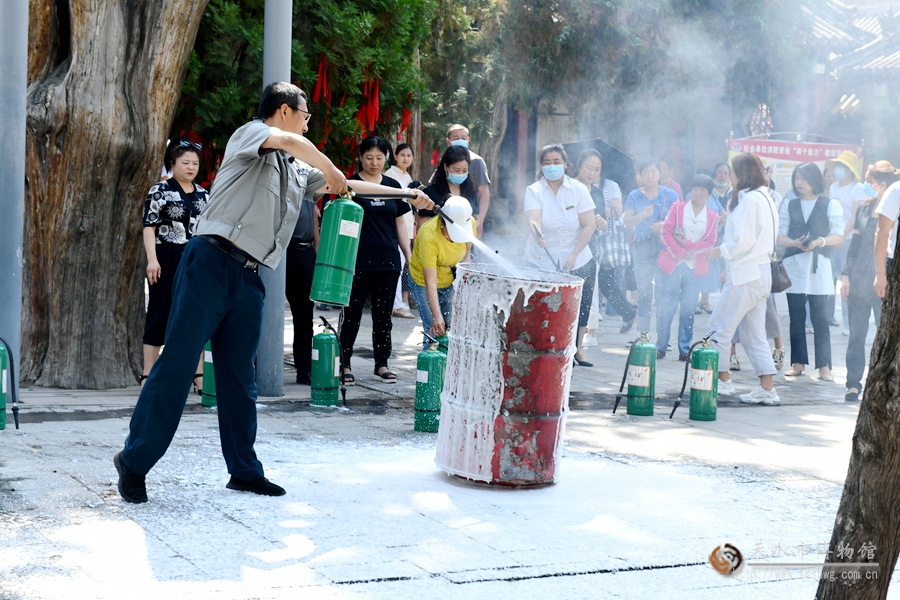 为深入贯彻落实习近平总书记关于安全生产重要论述精神,严格落实安全生产主体责任,确保2021年公祭伏羲大典顺利进行,结合国家、省、市文物局对开展“安全生产月”活动的统一部署和明确要求,有效落实近期相关安全文件及年初与相关单位签订的《安全目标管理责任书》精神,进一步夯实天水市博物馆安全基础工作,化解重大安全风险,切实做好市博物馆、伏羲庙景区文物和建筑的火灾防控工作,提高工作人员安全意识和处置突发事件的应变能力,切实推进社会单位消防安全“四个能力”建设,强化职工“安全第一”和“人民至上、生命至上”的理念,增强职工“保护文物功在当代、利在千秋”的观念,天水市博物馆于2021年中国文化和自然遗产日当天举办了消防知识培训暨应急疏散和灭火演练活动。市博物馆馆长刘玉璞、副馆长崔文刚,市消防支队、秦州区城乡环卫治理服务中心、秦州区西关街道办事处、秦州区消防大队等单位领导和工作人员约150余人参加了培训演练。