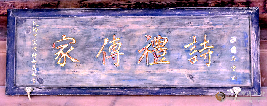 “诗礼传家”匾,悬挂于北宅子前院正厅门额。下款为“乾隆甲寅京师柳迈祖书”。诗:指《诗经》。礼:指《周礼》《仪礼》《礼记》。匾意以儒家经典及其道德规范世代相传。