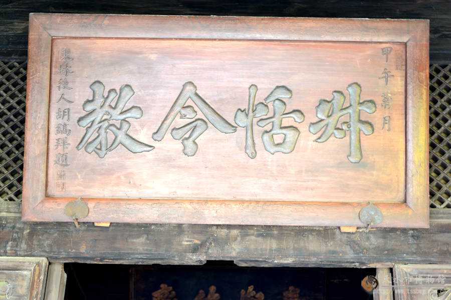 “淑恬令教”匾,悬挂于南宅子桂馥院前正厅的门额上。清乾隆三十九年(1774年)题。淑:温和,善良,多指女性。恬:安然,坦然,表示心境的平和。匾意赞扬匾主人用谦和善良、淡然平和的言行,教育后世子孙。
