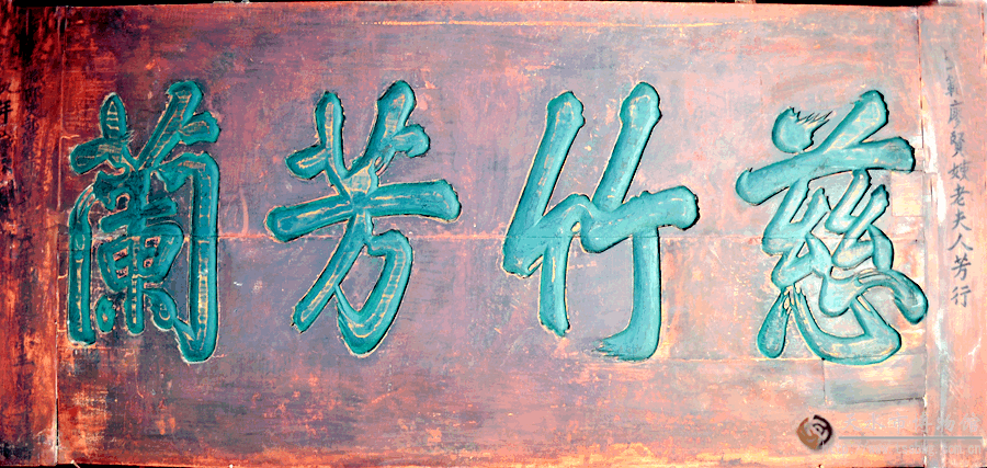 “慈竹芳兰”匾,悬挂于南宅子凌霄院北房门额上。清咸丰年间制。慈竹:又称义竹﹑慈孝竹﹑子母竹。丛生,一丛或多至数十百竿,根窠盘结。新竹、旧竹高低相倚,好比老少相依,因此得名。芳兰:香草。匾意为赞扬匾主人以如同慈竹芳草般慈爱高洁的品行教育子女。