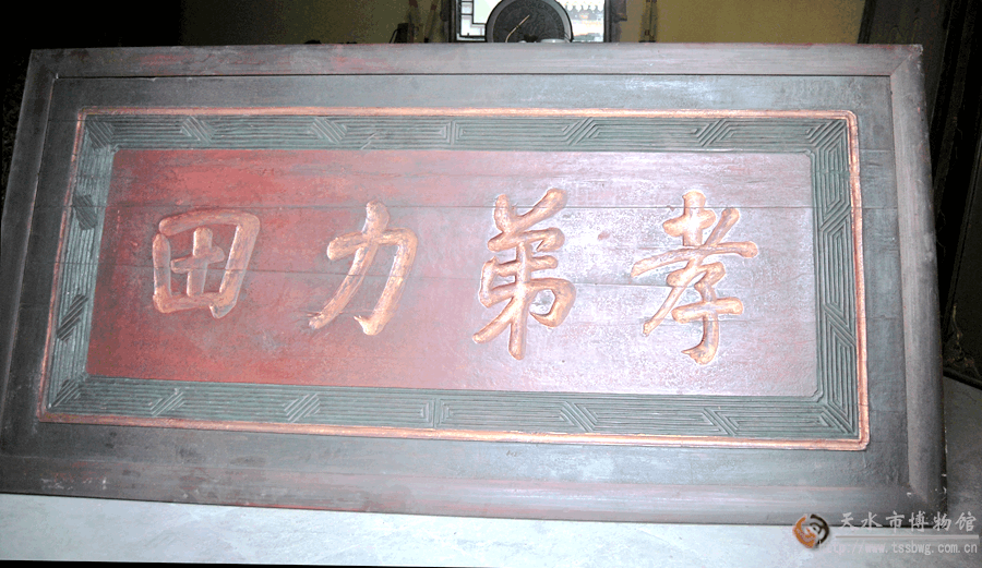 “孝弟力田”匾,现悬挂于南宅子银杏院北房。“孝弟力田”亦作“孝悌力田”。孝,指对父母的孝顺关爱。弟,即悌,指对兄长的敬爱。力田,指致力于田地劳作。孝悌和力田是中国古代农耕宗族社会极力倡导的行为,封建社会以“孝悌”来规范兄弟姐妹间的伦理关系。“悌”要求兄弟姐妹中排行小者对长兄的尊敬顺从,而一旦父亲去世,长兄便具有“父”的地位和威望,悌与孝便合而为一了。实现孝悌有利于宗族和睦、社会安定,因此清代以匾额倡导孝悌便大行其道。