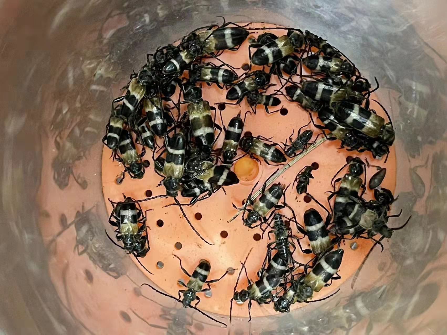 进入3月,春暖花开,万物复苏。随着气温回升,伏羲庙古树养护人员开启了捕捉害虫的模式,每日可捉到上百只天牛。双条杉天牛尤其喜欢侵害病弱的古树,它们是一种钻蛀性害虫,幼虫取食于柏树皮、木之间,切断水分、养分的输送,引起树木针叶黄化,长势衰退,甚至死亡。从2011年开始,天水市博物馆每年安排专人采收修剪掉的新鲜柏树枝,截短后扎成捆,放在古树根部。养护人员用它们来引诱天牛出洞产卵,然后定期清理树枝,消杀天牛。这种生物防治害虫的方法绿色环保,无毒无害,有效压低了天牛的密度,减小了天牛的危害,守护了伏羲庙的活文物。