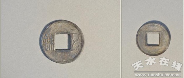 天水市博物馆馆藏的这枚西汉五铢钱文严谨规矩,小篆,“五铢”二字修长秀丽,“五”字交笔缓曲,上下与两横笔交接处略向内收。五铢钱“铢”字“金”头为箭镞形,四点方形较短。“朱”字头方折,下垂笔基本为圆折,头和尾与“金”字旁平齐,笔画粗细一致。钱径25毫米,重3.0克。五铢钱铸工精细,面背比较平整,内外郭宽窄均匀,钱型整齐。