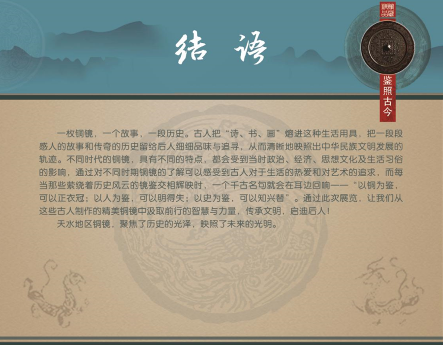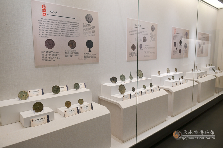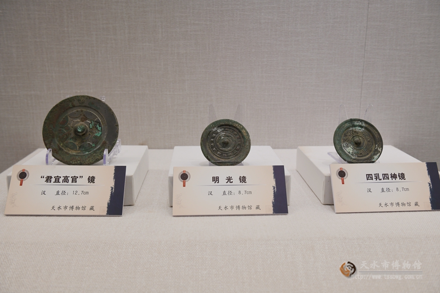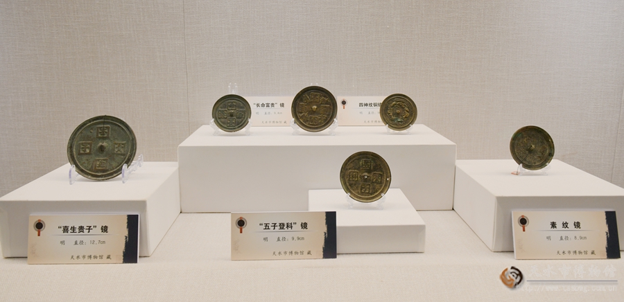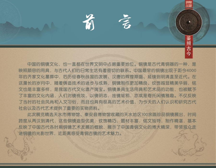 此次展览精选天水市博物馆、秦安县博物馆收藏的100余面珍品铜镜展出,时间跨度从两汉到清代,这些铜镜造型优美,纹饰精巧,题材丰富,铭文独特,制作精湛,基本完整地串联起了中国古代铜镜的发展脉络,系统展示了铜镜的历史价值、审美价值、科技价值和文化价值。此次展览以时代为主线,共分为:两汉镜鉴、繁华似镜、光鉴古今、镜里乾坤四个单元,采取图版、实物和铭文释读等多种形式,集中展示了中国青铜文化的博大精深,表现了铜镜在各个历史时代中的文化特征和工艺特点,让我们共同走进铜镜的世界,体味古人的文明与智慧。