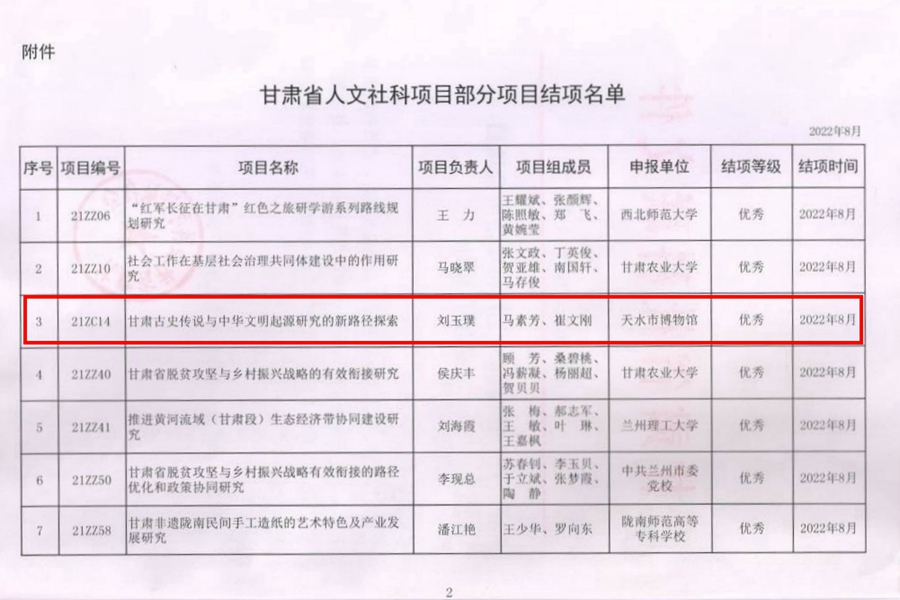 日前,甘肃省社科联下发通知,对63项省级课题予以结项。其中,由天水市博物馆馆长刘玉璞负责的“甘肃古史传说与中华文明起源研究的新路径探索”(项目编号21ZC14)符合结项要求,准予结项,并被评定为“优秀”等级。专家组鉴定认为:该课题重点研究黄河上游渭河流域伏羲、女娲、轩辕为代表的古史传说与该区域新石器考古遗址,二者的对比研究深化了主旨,完成的报告质量高,发表的论文质量亦较高,达到了结项要求。