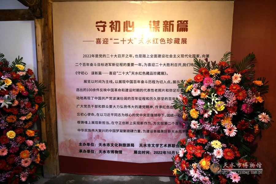 为喜迎党的二十大胜利召开,进一步弘扬伟大建党精神,传承红色基因,为建设幸福美好新天水凝聚更加磅礴的精神力量,由天水市文化和旅游局、天水市文学艺术界联合会主办,天水市博物馆承办的“守初心 谋新篇——喜迎二十大天水红色珍藏展”在天水市秦州区羲皇大道西路919号二楼展厅顺利开展。天水市委常委、宣传部部长王文东,市政府副市长刘国军参观了展览。