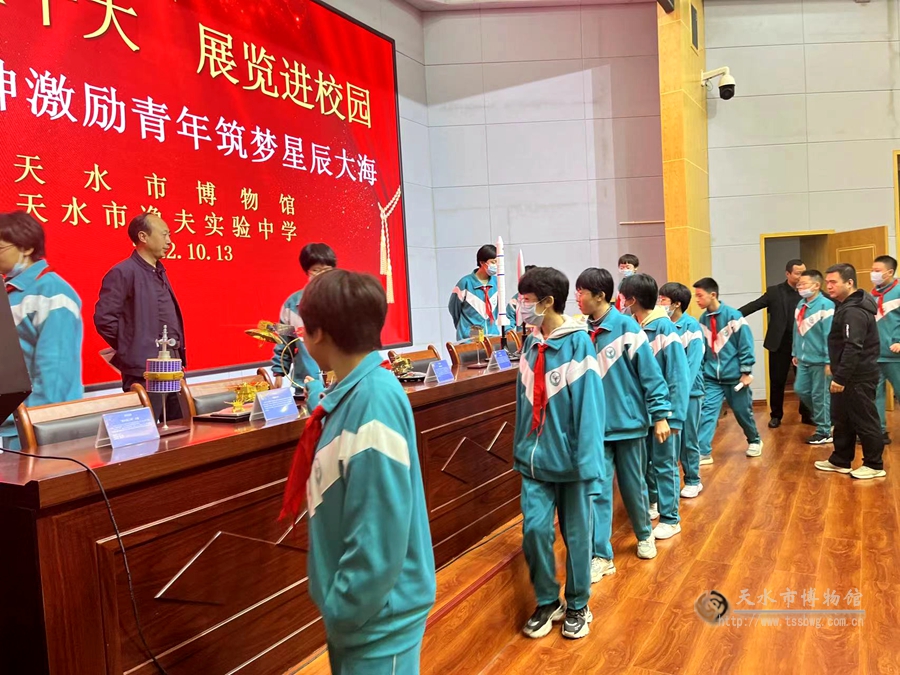 今年是新中国成立73周年,也是中国航天载人工程再创辉煌的一年,在党的二十大召开前夕,天水市博物馆联合金塔县博物馆,带着“金塔问天——趣味航天文化展”,继走进枣园巷小学、伏羲路逸夫小学之后,又来到天水市逸夫实验中学、天水市实验小学,开展“喜迎二十大 科普进校园”主题教育活动,以文博科普的形式带领青少年了解中国航天发展成就,铭记为祖国航天事业做出贡献的科技工作者,激励青少年从小树立远大志向,脚踏实地践行强国梦想。