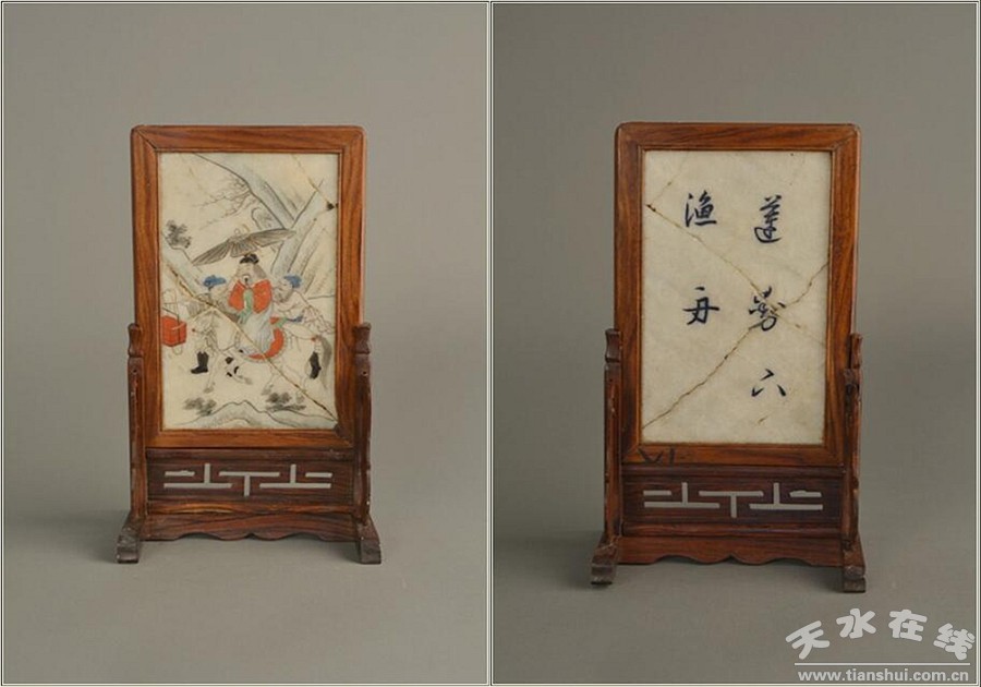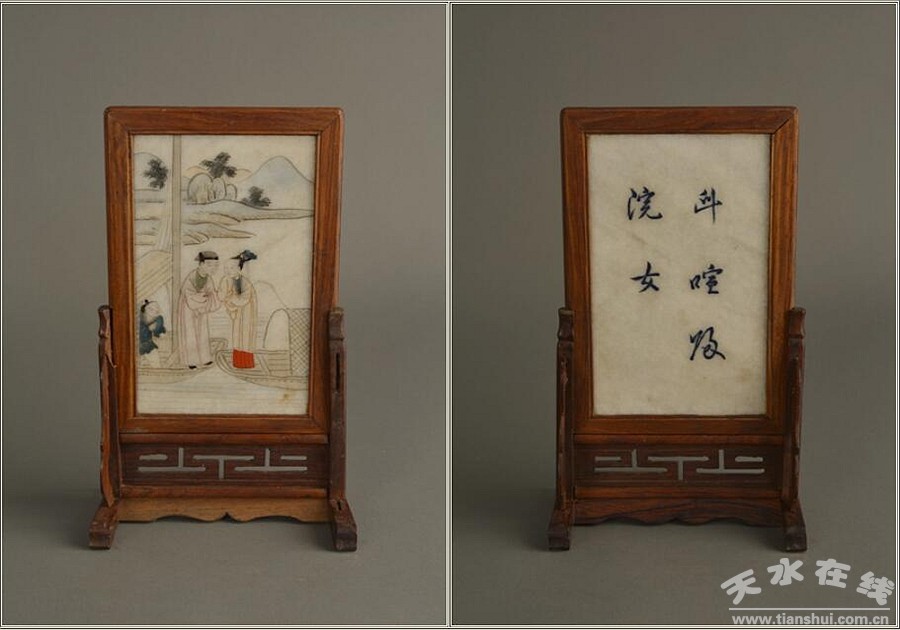 天水市博物馆所藏这两块砚屏均为1984年原文化馆移交。砚屏为长方形,插屏座,框为木制,由屏框、底座、屏心三部分组成。屏座镶绦环板,绦环内透雕回纹,卷云纹披水牙子。屏心为白色大理石,屏心一侧彩绘人物故事,一侧为阴刻填彩行书“竹喧归浣女,莲动下渔舟。”所选诗句出自唐代诗人王维的《山居秋暝》。
