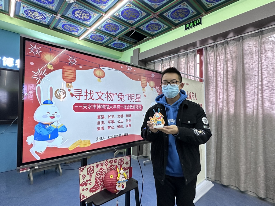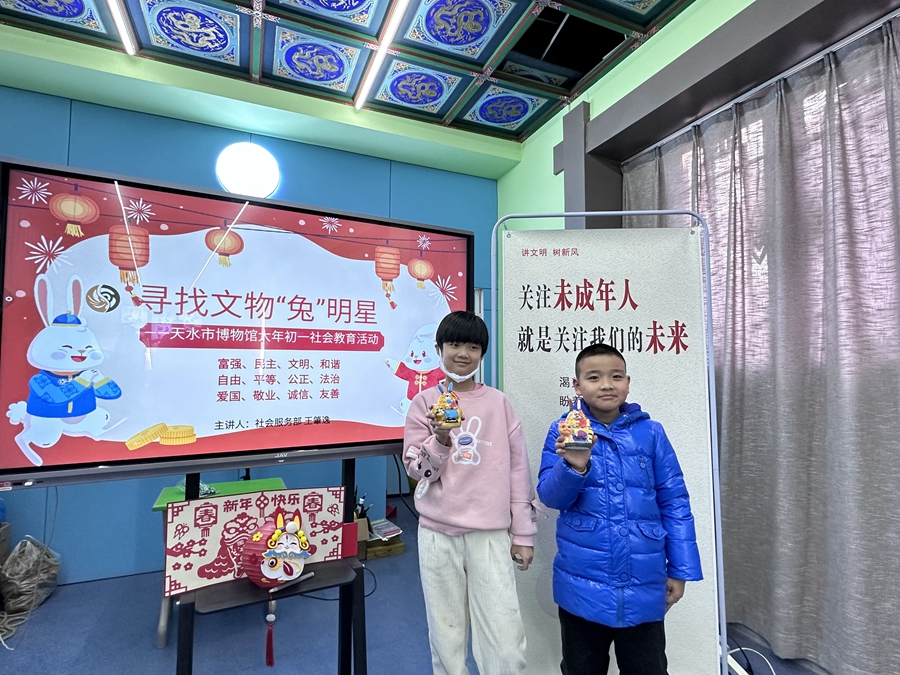 兔子在民间象征着吉祥、智慧和谨慎,“玉兔呈祥”之说一直深入人心,由来已久。与“兔”有关的故事和文物屡见不鲜,被人们津津乐道。为营造庆兔年新春的祥和氛围,让观众在欢乐祥和中度过一个意义非凡的春节假期,天水市博物馆在春节来临之际,开展“寻找文物兔明星”大年初一社会教育活动。