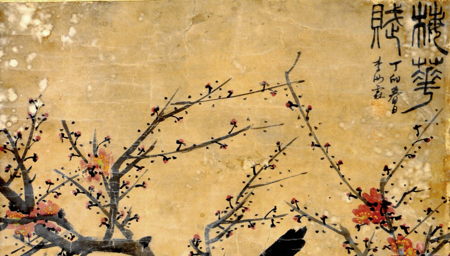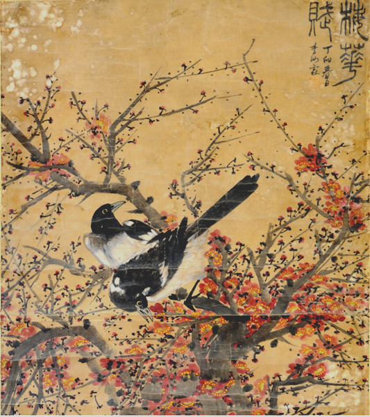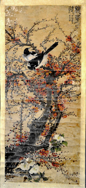 天水市博物馆就藏有民国李汝霖所绘《梅花赋》立轴一副。这件作品为纸本画,纵137厘米,横60厘米。图中绘老梅一棵,枝头喜鹊欢叫,梅下补画白山茶一株。红梅以皴擦写干,以表现老梅苍劲虬曲的姿态和表面纹理,以淡墨画横斜交叉的细枝,以浓淡相间的曙红点画花朵,以谨细之笔勾花蕊。整个画面在苍劲古朴中,蓬勃的生机喷薄绽放。画面右上角篆书“梅花赋”,并落“丁卯春日李汝霖”款。款后钤印两方:李汝霖印(朱文)汝霖(白文)。李汝霖,别号云麓,甘肃天水甘谷县人。近现代知名画家。擅花鸟、草虫。民国时居兰州以画为生,后陇上名家裴建准发现其才,收为门生,授以工笔画马,作品曾入选全国首届美展。