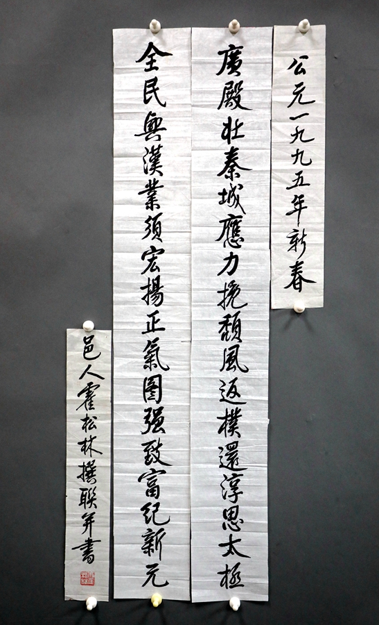 霍松林先生是享有国际学术声誉和影响的国学大师,中国古典文学研究专家、文艺理论家、诗人、书法家、教育家。其学术成就、人格魅力为学术界、教育界、文化界所敬重和仰慕。作为羲皇故里人,先生一生始终怀着一颗热爱家乡的赤子之心,他在《松林回忆录》中写到:爱亲爱乡,是爱民爱国的根本。人,是要有“根”的,不能“忘本”。这些言论正是他一生所遵循的,霍松林先生一直倾情关注并推动天水伏羲文化的宣传和研究,积极为家乡的文化建设著述立论、建言献策,做出了许多创造性、建设性、指导性的贡献。1988年,先生为首届公祭伏羲大典撰写祭文,1992年为首届伏羲历史文化研讨会论文集《伏羲文化》撰写序言,1995年为伏羲庙太极殿题词,对联手稿完成后,先生专为此事向时任民盟天水主委杨幼杰先生修书一封,他在书信中悉心嘱托对联刻制事宜,希望能在翌年杜甫陇右诗研讨会之前完成。遵照霍先生嘱托,天水市博物馆以此书制联悬挂于伏羲庙太极殿前,但遗憾的是此联原稿和相关信件曾隐入民间,不知所踪。此后,薛林荣先生无意间得知其下落,薛先生大义,不愿明珠蒙尘,专程上门购买,多年来妥善保管,最终捐赠于天水市博物馆收藏。