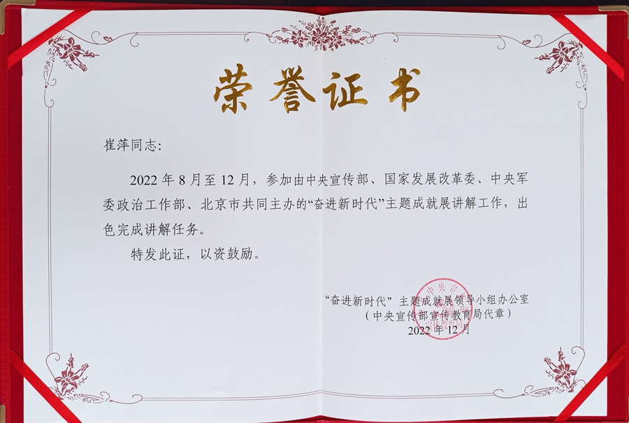 习近平总书记说:“青年强,则国家强。当代中国青年生逢其时,施展才干的舞台无比广阔,实现梦想的前景无比光明。”2022年7月,经过中宣部逐级遴选,甘肃省有5名讲解员入选“奋进新时代”主题成就展中央展区讲解团队,崔萍是其中之一。从参加培训至二十大开幕的两个多月时间里,来自全国各地的讲解员接受了紧张而充实的全方面培训,每个人都经过了数次深层的自我革命,获得了自身突破。“从最初的讲解培训,到一系列的严格训练和审查,近三个月的学习和实战演练,引导、仪态、站姿……很庆幸这些‘挑战’都被我逐一拿下。”崔萍表示。开展前讲解词前前后后经过近二十多次的修订,每次改动后隔天就逐一审查推演,并要求讲解员在短时间内熟练记忆并运用自如,还要主动增加展项知识的储备,积极拓展展板两三句描述以外的内容,应对专家老师们“精精益求精、万万无一失”的考核要求。这次培训对她不仅是一次系统全面的专业提升,也是非常难得的学习经历。经过上百次的审查、数百次的推演和模拟练习后,讲解团队以饱满的工作热情和过硬的工作作风高效的服务于这次国家级高规格大型展览,而经过集中培训的崔萍最终担任中央综合展区第十一、十二单元讲解员,负责讲解中国特色大国外交和全面从严治党内容。2022年10月17日晚的二十大代表专场讲解工作,根据安排崔萍为甘肃代表团进行讲解。“有幸为家乡的代表们讲解,我感到非常荣幸,接下来也会继续完成好后面的重要接待任务。”崔萍说。整个展览期间,崔萍圆满完成中央领导同志、党的二十大代表和列席代表、中央党政军群各部门党员干部、解放军和武警部队官兵、各国驻华机构负责人等重要专场接待和日常讲解接待任务,为“奋进新时代”主题成就展讲解工作作出积极贡献。