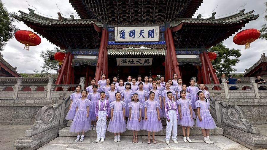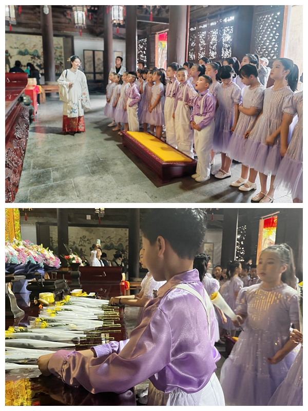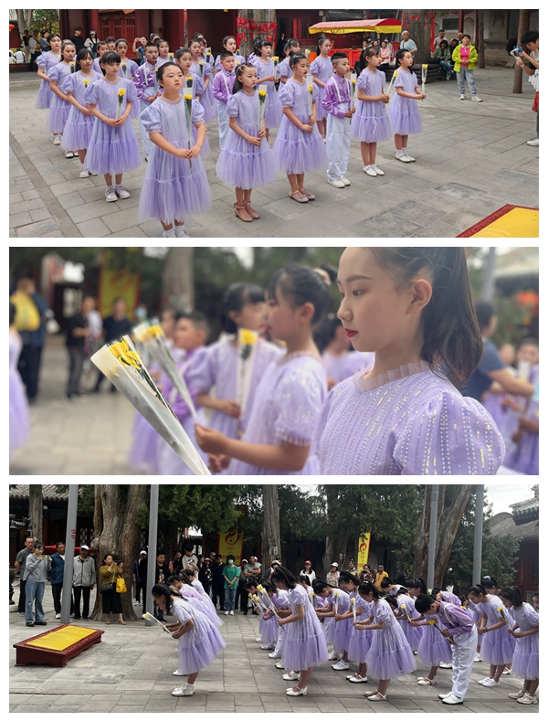 在伏羲庙中院祭祀区,同学们在庄严肃穆的礼乐声中,参加祭祀仪式。他们手捧菊花,面向始祖塑像鞠躬致敬;大声诵读曹植所作的《伏羲赞》,重温古人对始祖伏羲的礼赞;童声合唱《说伏羲》,传递现代人对伏羲的追思与敬仰。孩子们的声音极具感染力,庙区内的游客在纯净的诵读吟唱声中品味伏羲文化,感受羲皇儿女继承弘扬伏羲文化的一片赤诚。