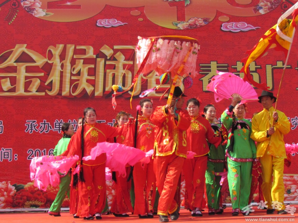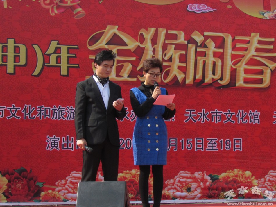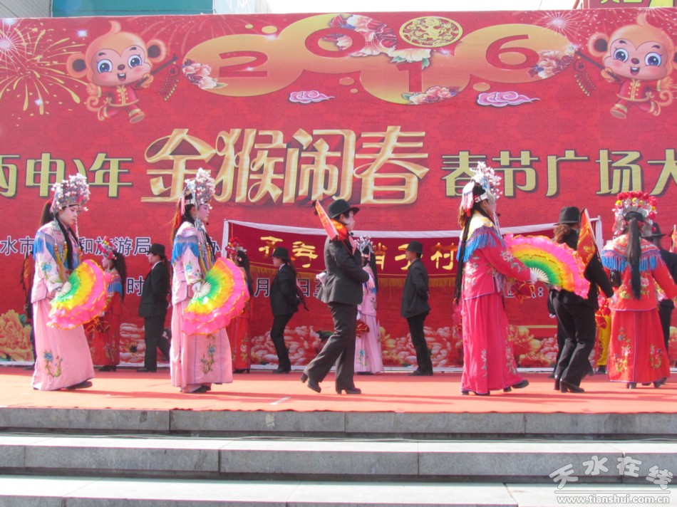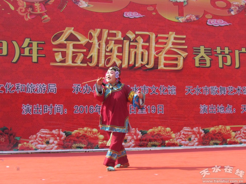 神州大地到处春潮涌动,龙城广场洋溢着新春的气息。2月16日(农历正月初十)下午,正值全市人民欢度春节之际,由天水市文化和旅游局主办,天水市文化馆、天水市歌舞研究中心承办,天水市公安局协办的2016(丙申)年“金猴闹春”春节广场大型文艺汇演第四场演出秦州小曲在龙城广场精彩上演。正月十一日演出的节目是天水市文化馆精心筹备的第四场春节专场文艺演出,本场演出分别有秦州小曲、娘娘坝黑社火、齐寿社火表演。