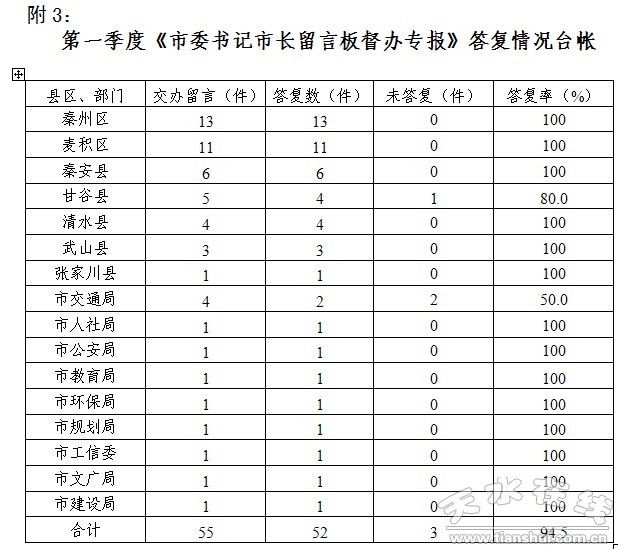 按照《天水市委书记市长留言板办理工作规定》的要求,我中心及时对网民留言所涉及的部分热点、难点问题以及网民诉求,以《市委书记市长留言板督办专报》的形式交转各县区、市直有关部门、单位负责办理并要求在网上答复。2013年第一季度共印发《督办专报》17期,涉及督办问题、诉求55件,办理答复52件,答复率为94.5%。按要求限时办理答复的县区、部门、单位有:麦积区政府、秦州区政府、清水县政府、秦安县政府、武山县政府、张家川县政府、市发改委、市教育局、市环保局、市规划局、市公安局、市工信委、市文广局、市建设局。未按要求及时办理答复的县和部门有:甘谷县政府、市交通局。(附《督办专报》办理答复情况统计台账)