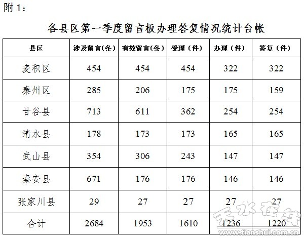 附:1、各县区第一季度留言板办理情况统计台帐