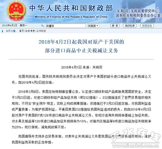 经国务院批准,国务院关税税则委员会决定对原产于美国的部分进口商品中止关税减让义务,自2018年4月2日起实施。