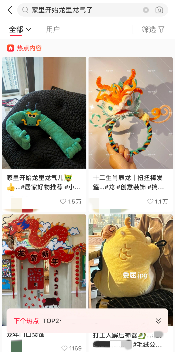 2023年12月28日,“家里开始龙里龙气了”登上了社交媒体热搜榜榜首。不少博主晒出与龙相关的家居产品,龙形抱枕、丑萌的龙玩偶、纯手工龙灯、腾云驾雾的龙年春联周边,网友称“氛围已经到这了,就差过年了!”