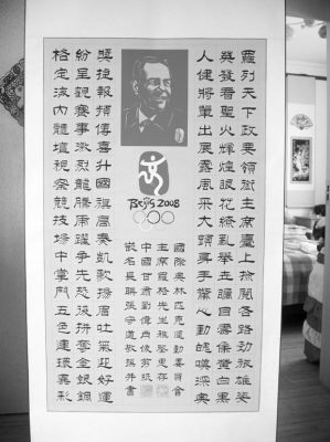 为庆祝奥运会在北京成功举办,并向国际奥委会主席罗格送上一份真挚的祝福,定西市剪纸艺术家刘伟和著名诗人张守道合作,为罗格主席创作了肖像剪纸和嵌名诗。张守道为罗格主席创作的嵌名诗是:“罗列天下政要,领衔主席台上,检阅各路劲旅,雄姿英发,看圣火辉煌,眼花缭乱,举世瞩目,云集黄、白、黑人,健将辈出,展露风采,大显身手,惊心动魄叹圣奥。格定海内体坛,视察竞技场中,掌门五色连环,异彩纷呈,观赛事激烈,龙腾虎跃,争先恐后,拼夺金、银、铜奖,捷报频传,喜升国旗,高奏凯歌,扬眉吐气迎好运。”日前,诗作及肖像剪纸已通过省上有关部门送往北京。