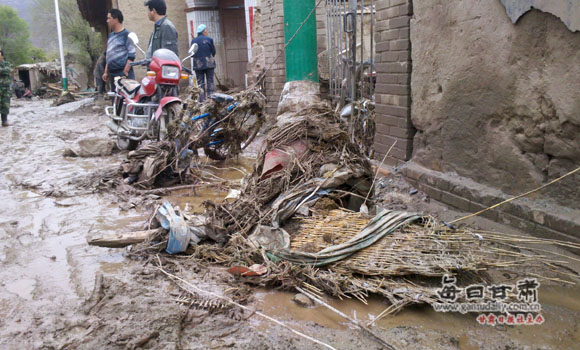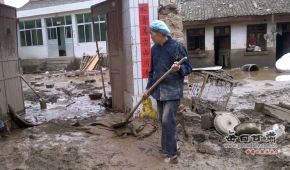 (受灾群众正在清理淤泥。 甘肃日报记者 白德斌 摄)