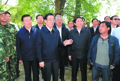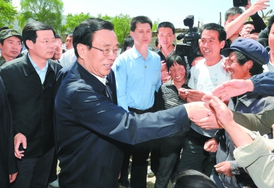 5月10日,甘肃省定西市部分地区突发特大冰雹山洪泥石流灾害,造成重大人员伤亡和财产损失。灾情牵动着贺国强的心。19日上午,在飞往定西的飞机上,贺国强认真察看地图,向随行的有关部门负责同志详细了解灾情和抢险救灾情况,就进一步做好抗灾救灾工作进行研究。