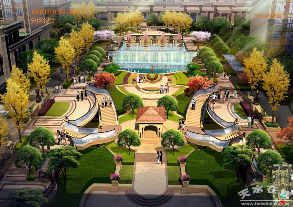 建筑的合理布局与下沉式广场的设置,为立体式园林景观的建设提供了可能,入住其中的小区业主,将由以往传统的二维景观视野,转换为三维立体景观视野,以提升小区业主整体的空间立体感受。再通过大乔木、小乔木、灌木、花卉、草坪的综合配置,构筑出整个小区五层的多层次景观,通过空间和层次的变化,实现移步换景、步移景异的园林景观效果。