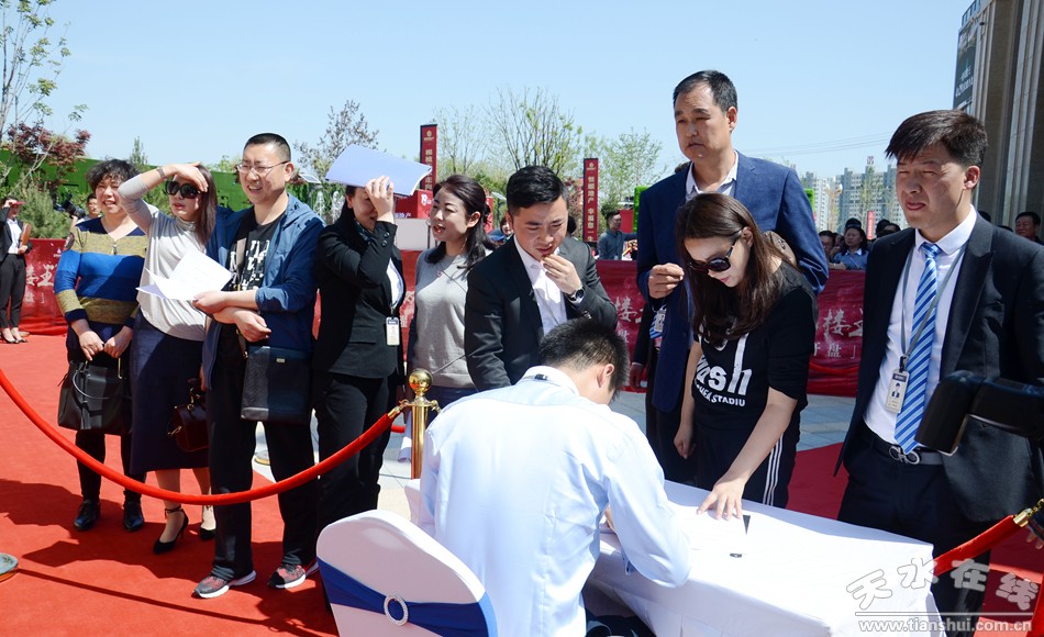 临近14点,到访人流已经达到高峰,伴随着签到区前人群涌动,不时场外更有一批客户匆匆到来。等候区内也早已聚集了诸多客户,大家或与邻近亲切交流,或者不时拿出手机关注时间,大家都期待着选择自己心仪美宅的那刻的到来。