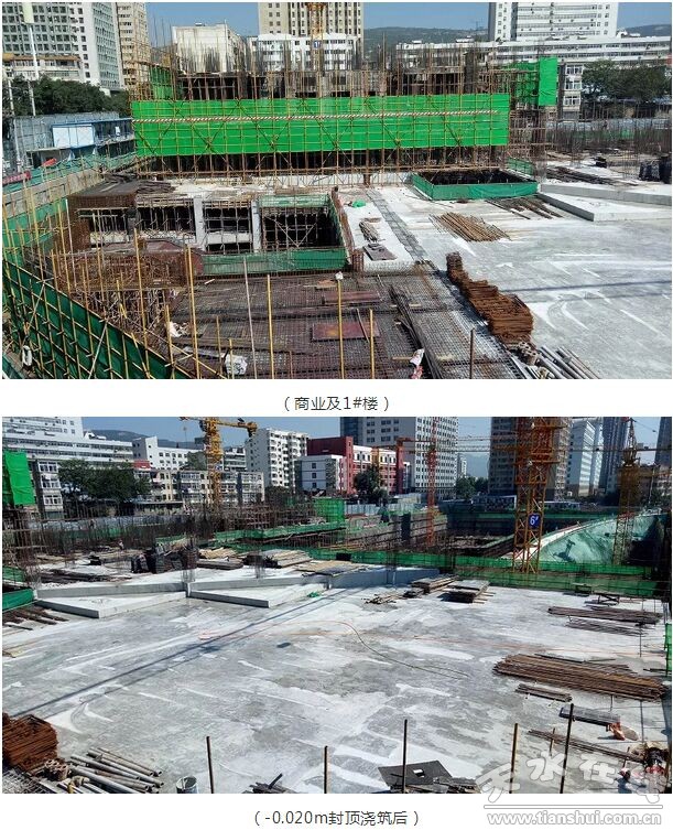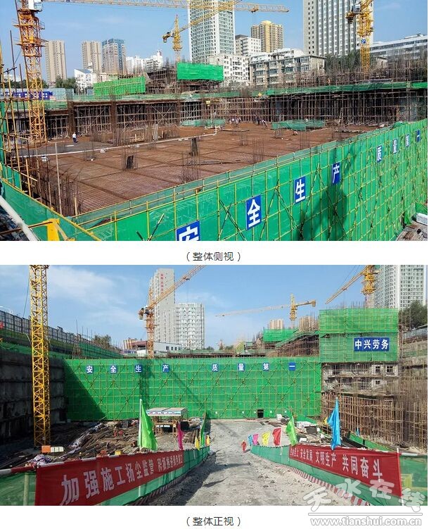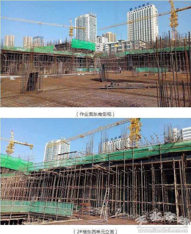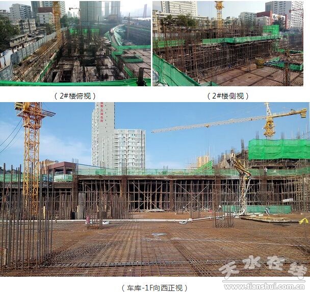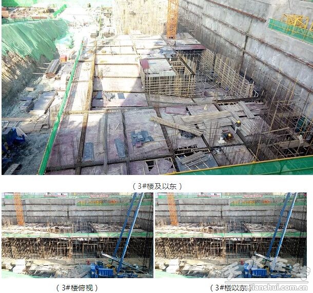 3、3#楼(-19.82m~-13.22m),剪力墙、柱、绑扎钢筋现已完毕,正在安装模板,搭设架体。